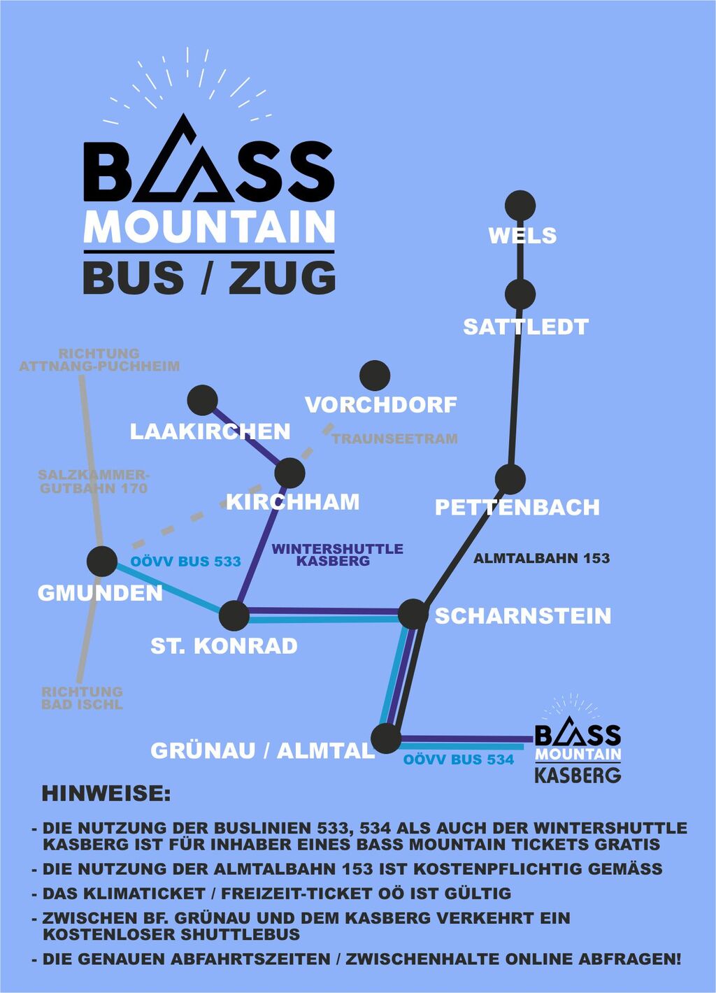 Ja, es gibt einige öffentlich Buslinien nach Grünau und zum Kasberg. AUßerdem haben unsere Freunde von Russn Soda wieder Shuttle Busse zu BASS MOUNTAIN geplant. Alle Infos dazu findest Du hier.